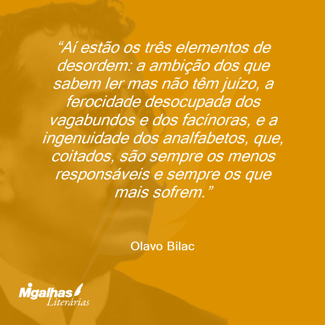 Aí estão os três elementos de desordem: a ambição dos que sabem ler mas não têm juízo, a ferocidade desocupada dos vagabundos e dos facínoras, e a ingenuidade dos analfabetos, que, coitados, são sempre os menos responsáveis e sempre os que mais sofrem.