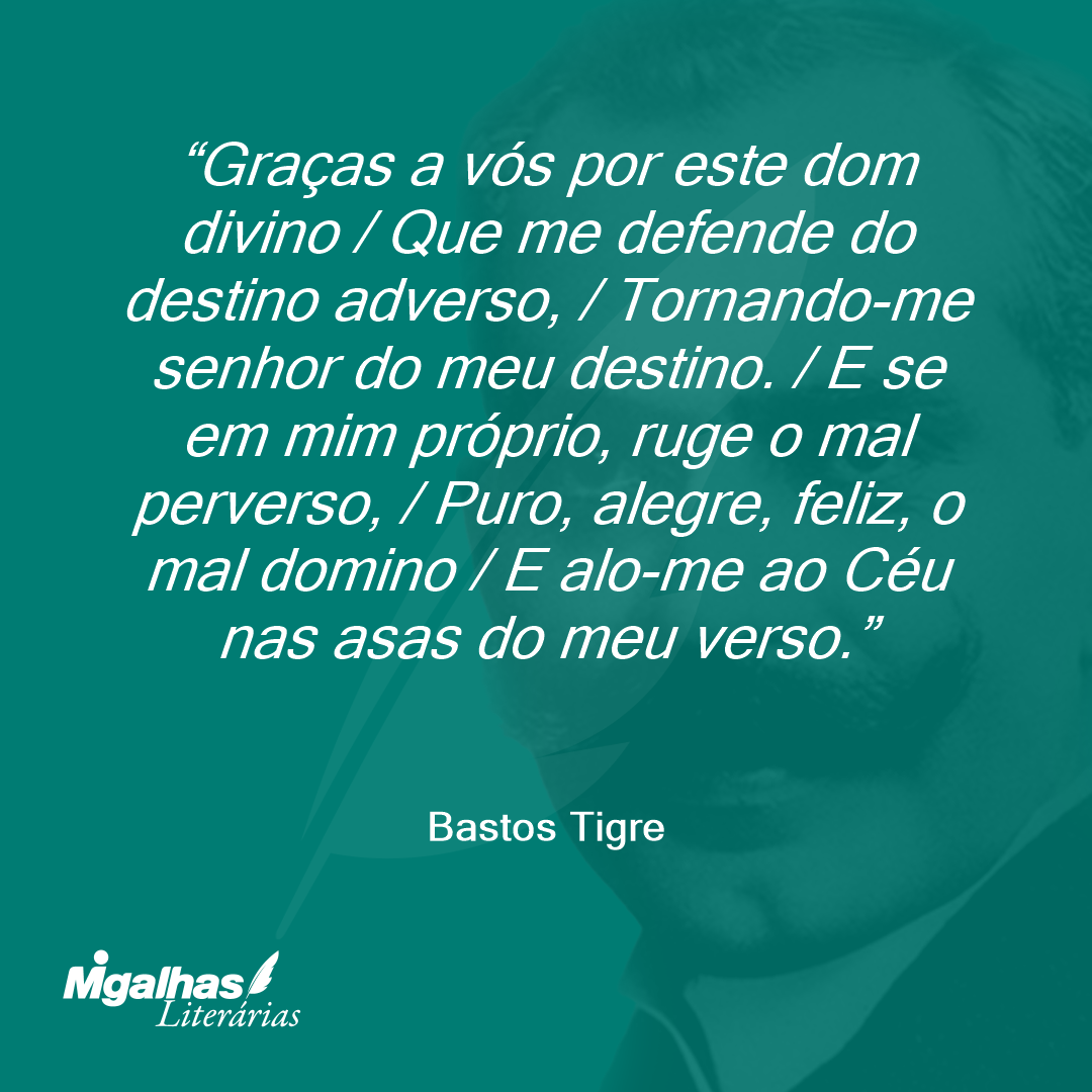 Graças a vós por este dom divino / Que me defende do destino adverso, / Tornando-me senhor do meu destino. / E se em mim próprio, ruge o mal perverso, / Puro, alegre, feliz, o mal domino / E alo-me ao Céu nas asas do meu verso.
