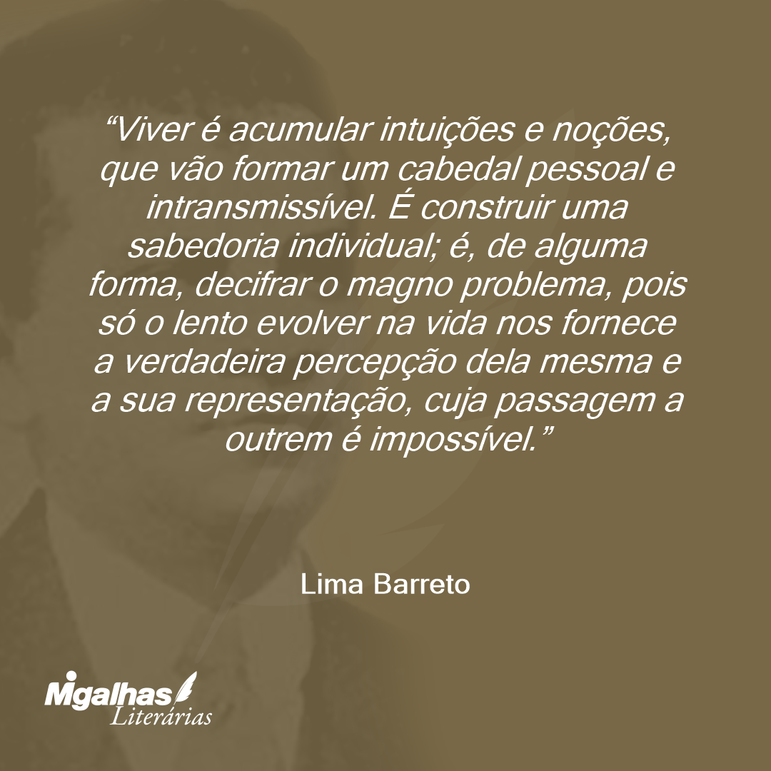 Viver é acumular intuições e noções, que vão formar um cabedal pessoal e intransmissível. É construir uma sabedoria individual; é, de alguma forma, decifrar o magno problema, pois só o lento evolver na vida nos fornece a verdadeira percepção dela mesma e a sua representação, cuja passagem a outrem é impossível.