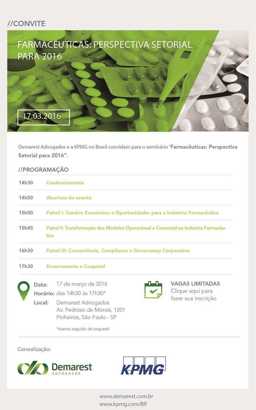 O Demarest Advogados e a KPMG realizam, dia 17/3, às 14h, em SP, o seminário "Farmacêuticas : perspectiva setorial para 2016". O evento vai abordar o cenário econômico e as oportunidades de negócios, os novos modelos operacionais do setor e falar ainda sobre compliance e governança corporativa.