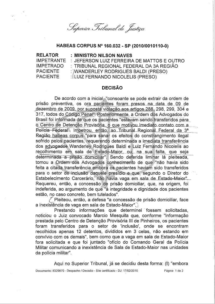 O ministro Nilson Naves, do Superior Tribunal de Justiça, deferiu liminar em pedido de habeas corpus, impetrado pela OAB/SP, e concedeu prisão domiciliar aos advogados W.R.B e L. F. N, inscritos em Santa Catarina e que se encontravam custodiados no Centro de Detenção Provisória III, em São Paulo. O ministro lembrou que o Estatuto dos Advogados (Lei 8.906/94) garante a todos os advogados o direito de serem cautelarmente constritos em sala de Estado-Maior ou, em sua falta, em prisão domiciliar.