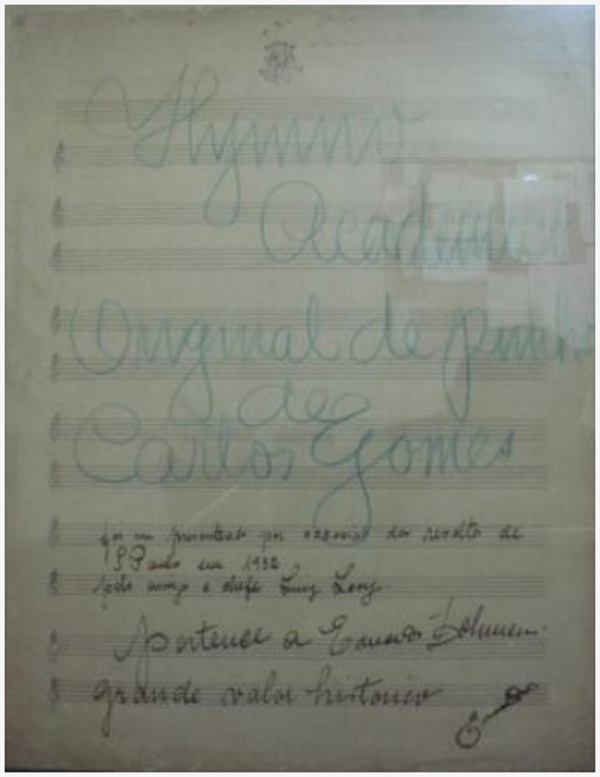 Em 1859, do encontro de Carlos Gomes e Francisco Leite de Bittencourt Sampaio, estudante de Direito, surgiu o Hino Acadêmico. O primeiro, responsável pela música; o segundo, pela letra.