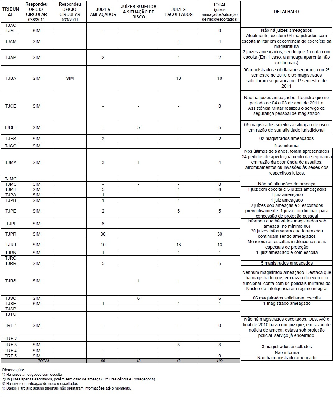 De acordo com as informações prestadas pelos tribunais, há 69 juízes ameaçados, 13 sujeitos a situações de risco e 42 juízes escoltados. Muitos magistrados se enquadram em duas situações ao mesmo tempo - ameaçados com escolta, ou em situação de risco com escolta, por exemplo.