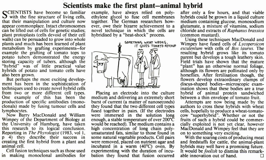 Em 1983, a revista Veja reproduziu uma reportagem inverídica publicada pela revista New Scientist sobre um fruto resultante da fusão de células de boi com tomate.