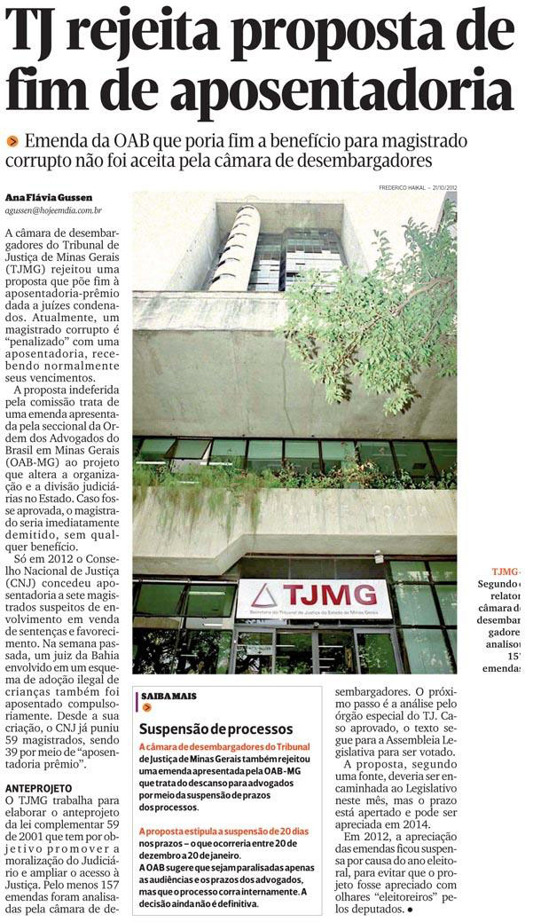 O presidente do TJ/MG, Joaquim Herculano, respondeu em nota matéria do jornal Hoje em Dia publicada em 11/10, que tratava da rejeição por parte do tribunal de proposta da OAB/MG para acabar com aposentadoria prêmio de magistrados condenados.