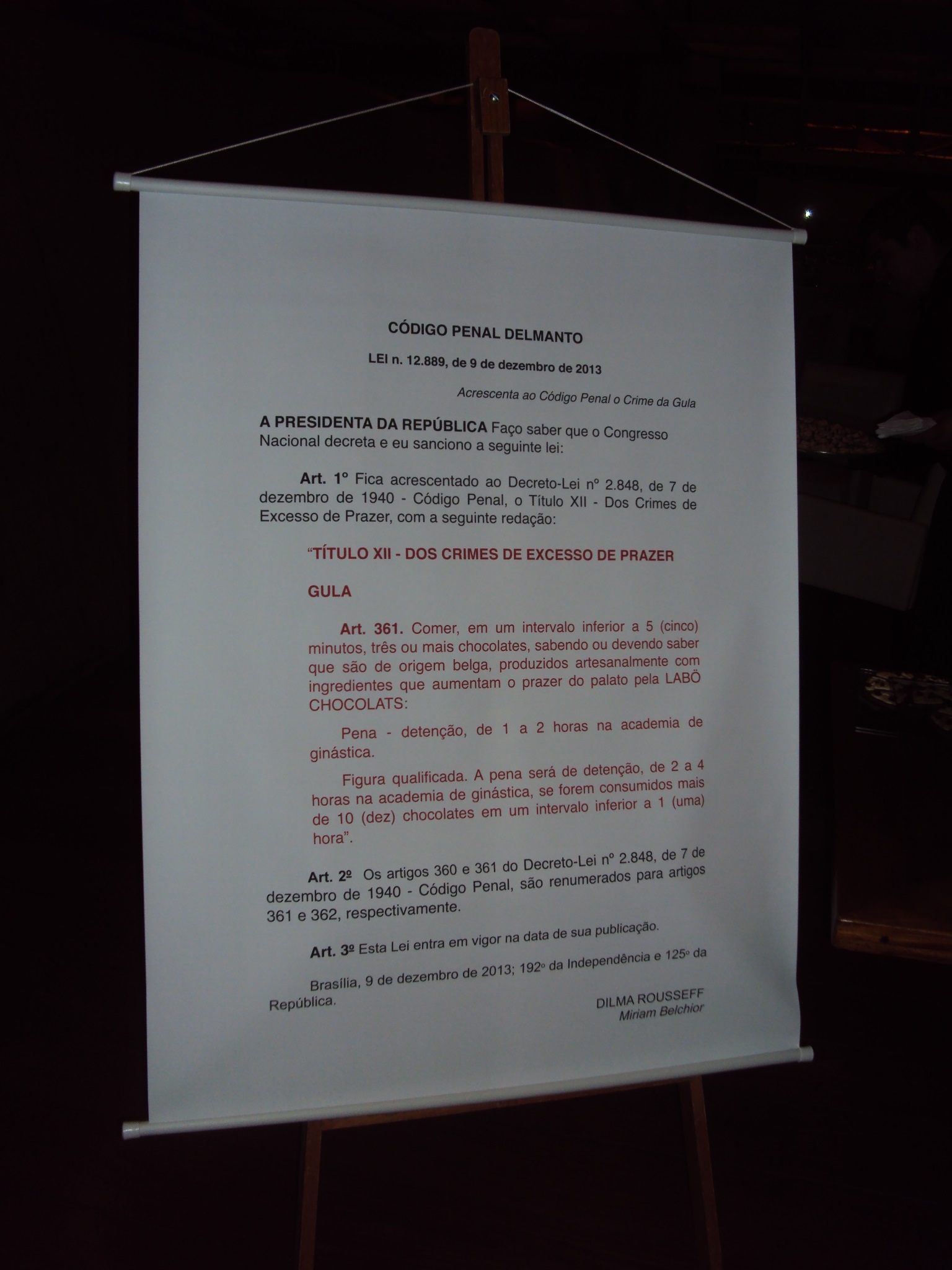 Com todo gabarito profissional dos anfitriões, a classe jurídica conheceu ainda o "Código Penal Delmanto", que dispõe sobre os crimes de excesso de prazer. "Para quem comer, em um intervalo inferior a cinco minutos, três ou mais chocolates, pena de uma a duas horas de academia". Acompanhando o divertido Código, uma deliciosa mesa de chocolates finos batizados de assédio sexual, estelionato, crime doloso, colarinho branco, entre outros. Confira as fotos :