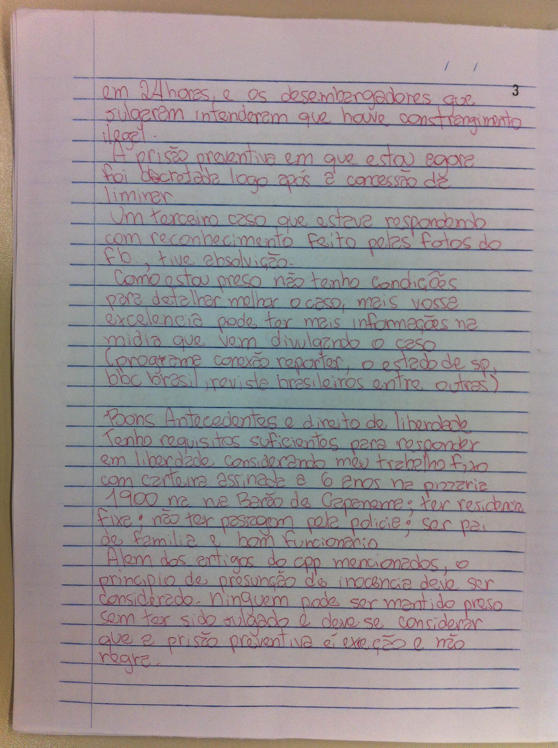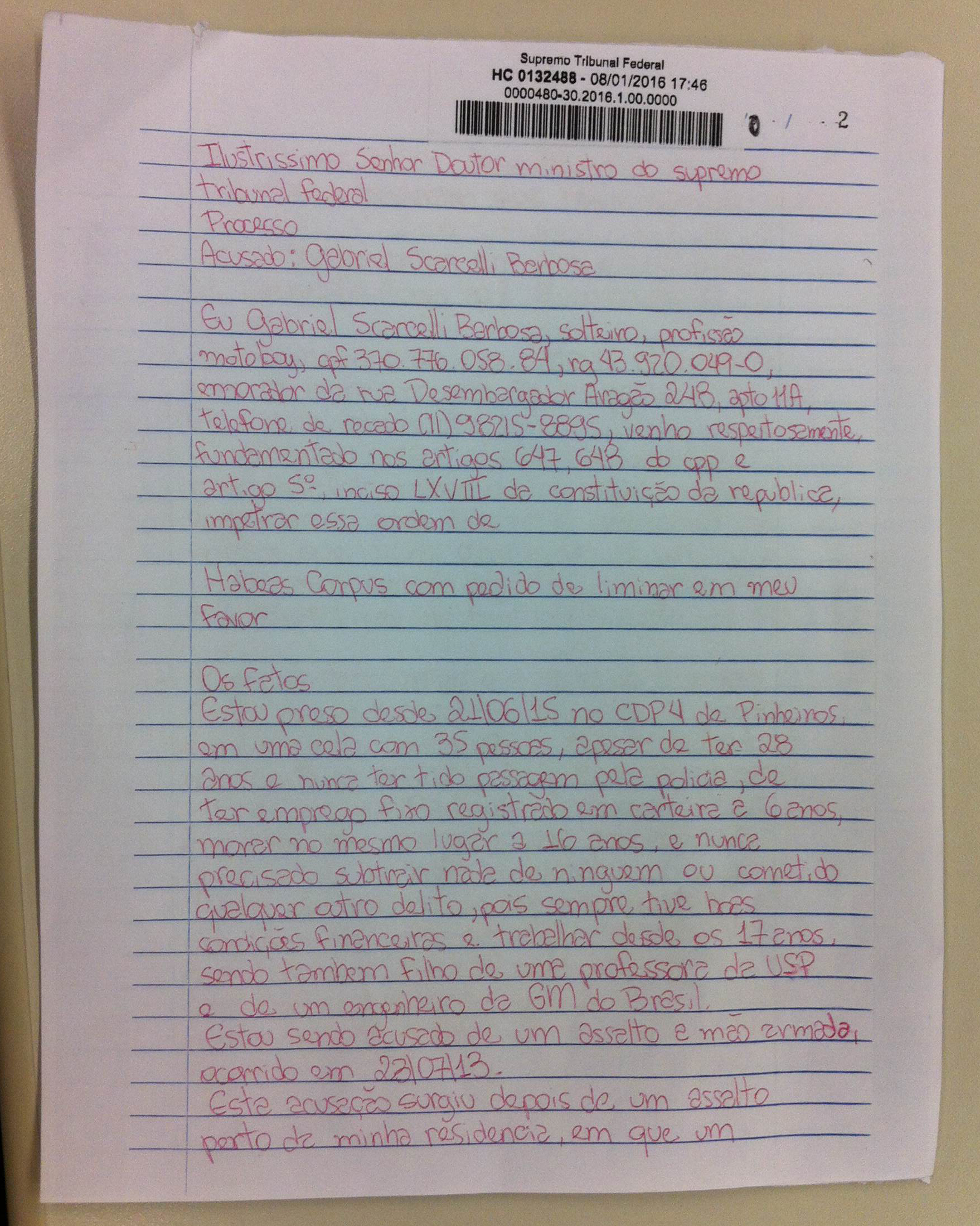No exercício do plantão da Corte, o presidente do STF, ministro Ricardo Lewandowski, determinou a revogação da prisão preventiva do motoboy Gabriel Scarcelli Barbosa - preso desde junho do ano passado na capital paulista acusado de roubar um carro. Scarcelli impetrou o HC no Supremo escrito de próprio punho (veja imagens abaixo).