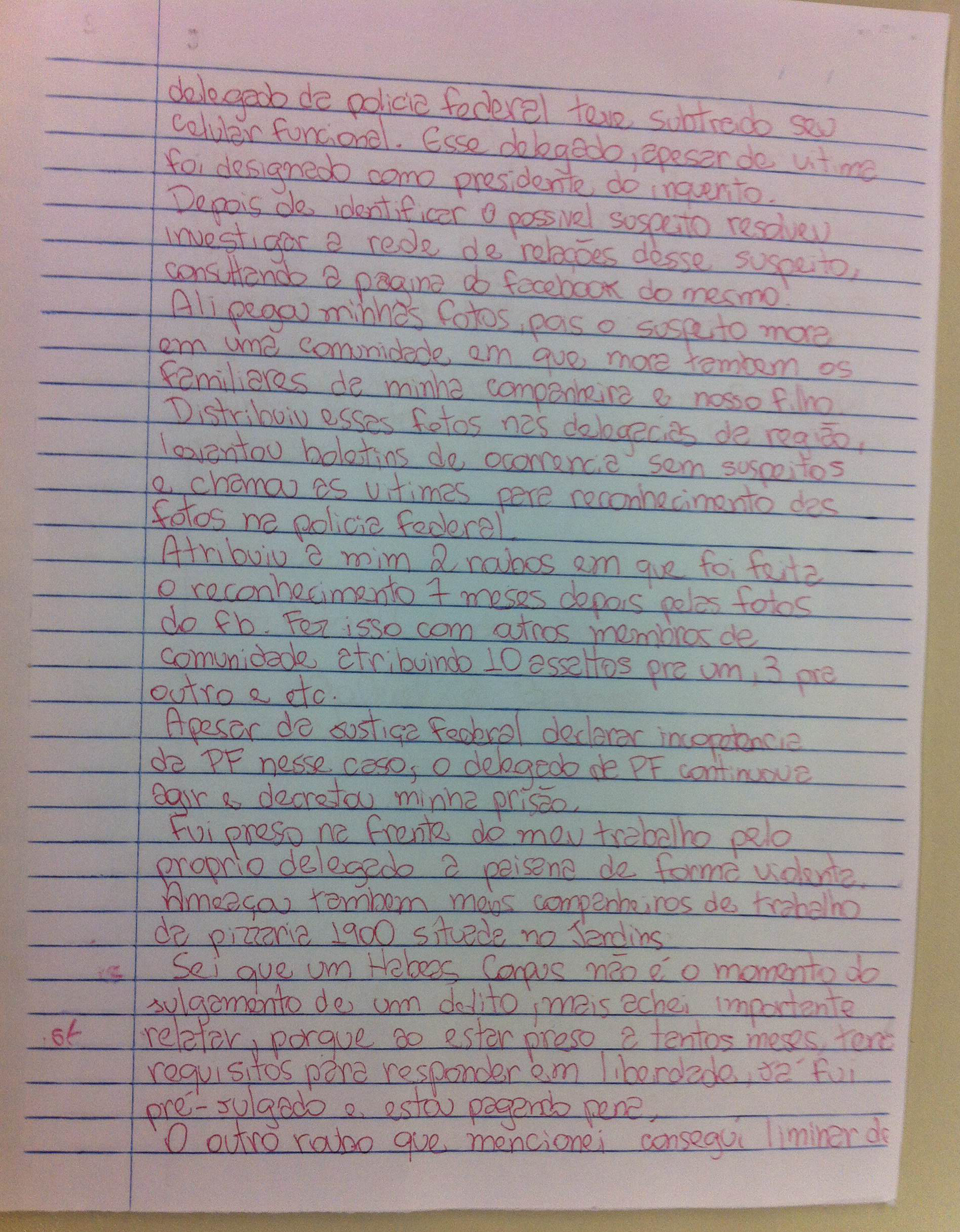 "Estou sendo acusado de um assalto a mão armada, ocorrido em 23/07/13. Esta acusação surgiu depois de uma assalto perto da minha residência, em que um delegado da Polícia Federal teve subtraído seu celular funcional. Esse delegado, apesar de vítima, foi designado como presidente do inquérito. Depois de identificar o possível suspeito resolveu investigar a rede de relações desse suspeito, consultando a página do Facebook do mesmo. Ali pegou minhas fotos, pois o suspeito mora em uma comunidade em que moram também familiares da minha companheira e nosso filho. Distribuiu essas fotos nas delegacias da região, levantou boletins de ocorrência sem suspeitos e chamou as vítima para reconhecimento das fotos na Polícia Federal. Atribuiu a mim 2 roubos em que foi feito reconhecimento 7 meses depois pelas fotos do FB."