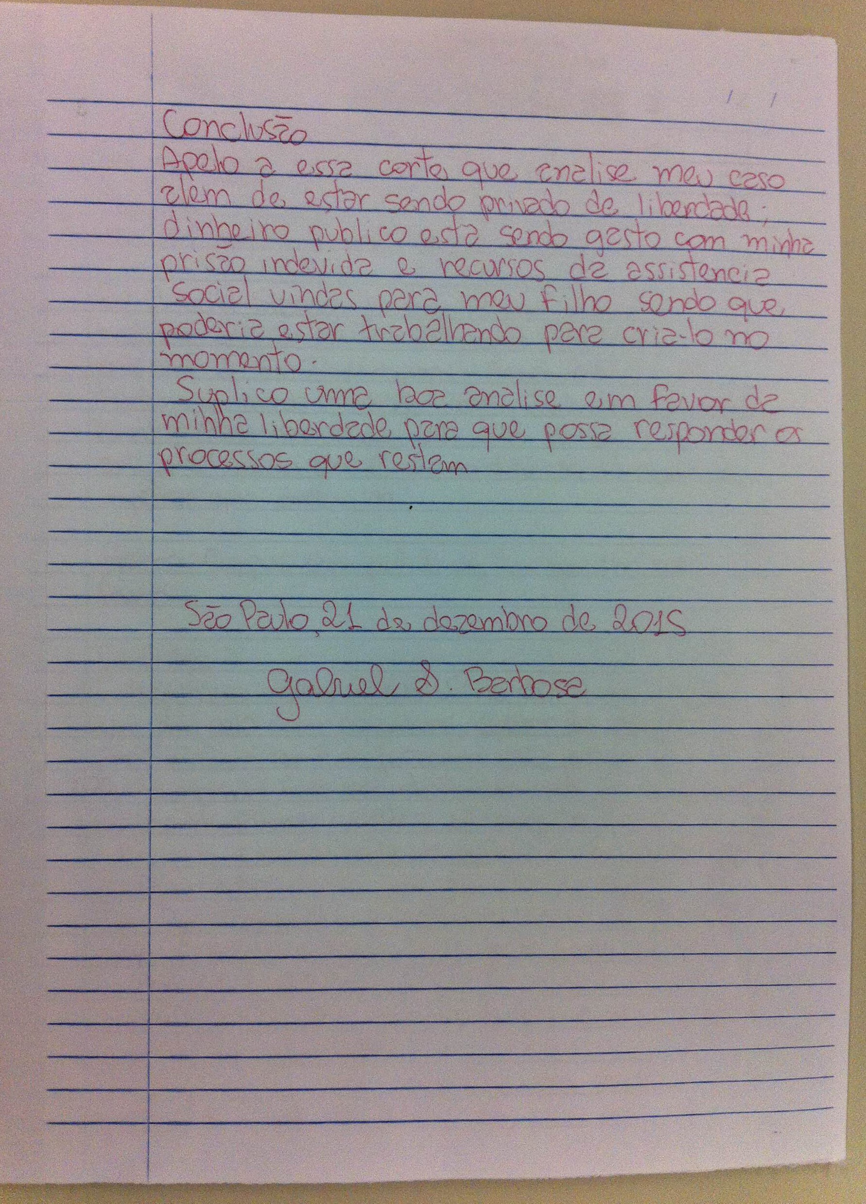 No HC, Gabriel ainda aponta que, além de ser privado de liberdade, dinheiro público estari sendo gasto com sua "prisão indevida". "[Há] recursos de assistência social vindo para meu filho, sendo que poderia estar trabalhando para cria-lo no momento."