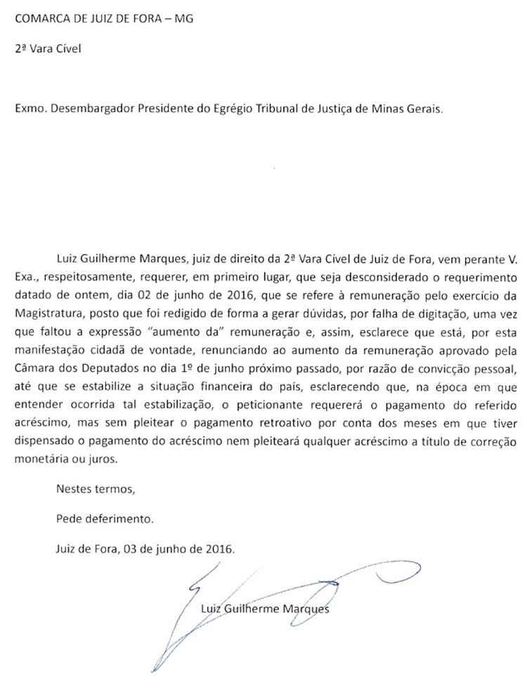 Contrário à deliberação, em iniciativa inédita, o juiz de Direito Luiz Guilherme Marques, da 2ª vara Cível de Juiz de Fora/MG, enviou documento ao presidente do TJ/MG no qual abre mão do aumento, "por razão de convicção pessoal, até que se estabilize a situação financeira do país".