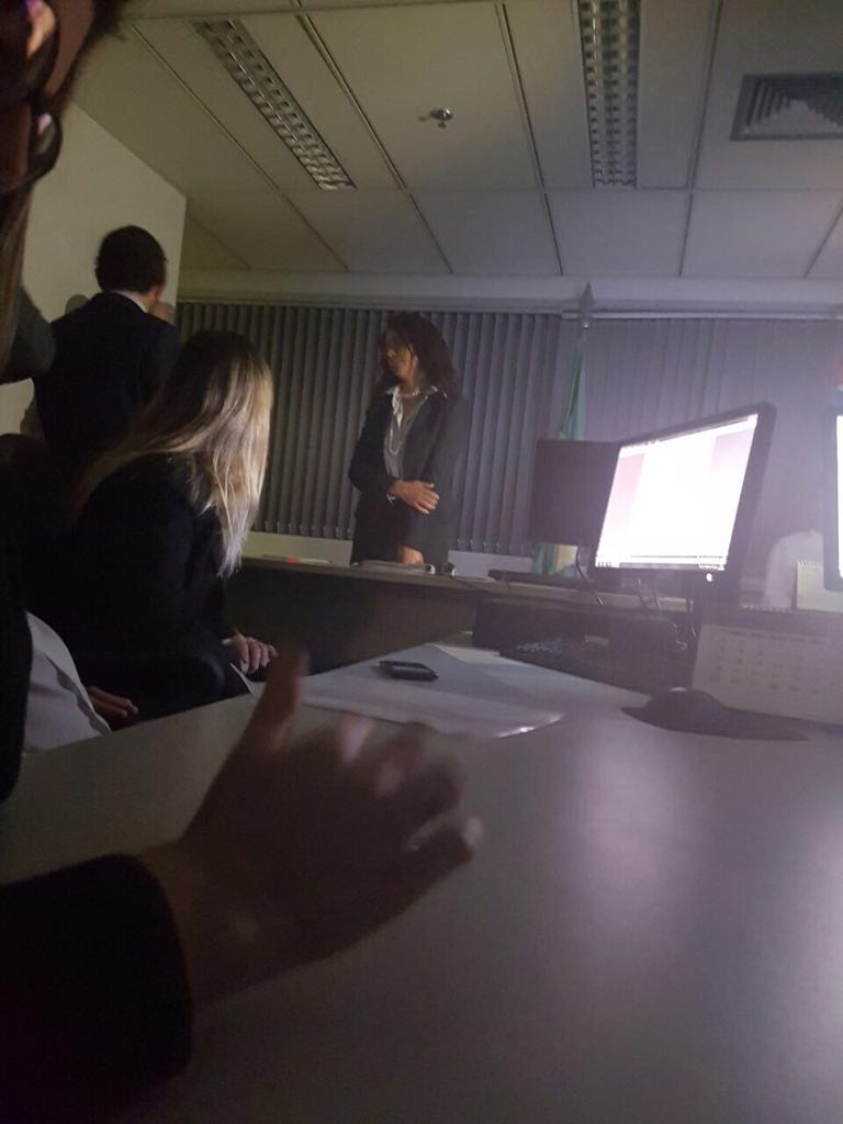 Às 20h, com juíza, demais funcionários do gabinete e secretaria e partes ainda em sessão, as luzes do monumental prédio foram apagadas. Tal se deu diante dos esforços engendrados pela administração do tribunal relacionados à redução de custos.