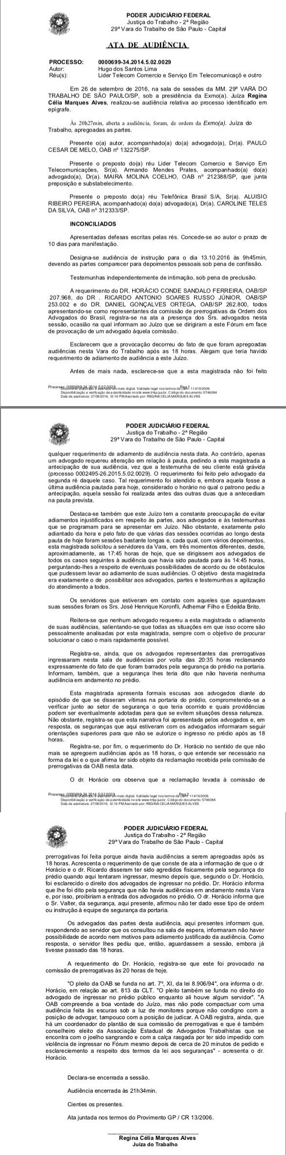 No começo desta semana, advogados protestaram por meio das redes sociais contra ato da juíza Regina Célia Marques Alves, titular da 29ª vara do Trabalho de SP, pois ela teria realizado audiências no Fórum Ruy Barbosa após as 18h, na segunda-feira, 26.