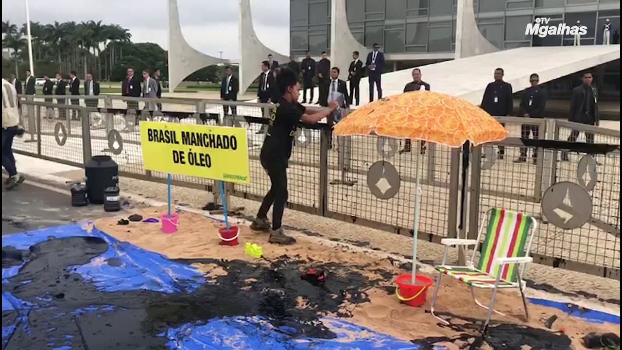 Com roupas pretas, os manifestantes levantaram faixas criticando a "lentidão" do governo Federal em conter as manchas nas praias. Também posicionaram barris em frente ao Palácio representando barris de petróleo e despejaram um líquido preto, feito com óleo e tinta, sobre areia distribuída em uma lona azul. Veja