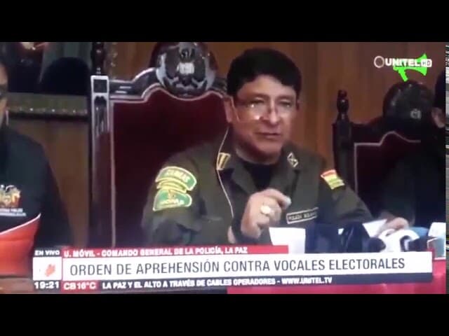 A presidente do TSE - Tribunal Supremo Eleitoral da Bolívia, María Eugenia Choque Quispe, e seu vice, Antonio Costas, que também renunciaram ao cargo, foram presos, junto com outros 36 funcionários da Corte, por suspeita de fraude no processo de apuração das eleições presidenciais.