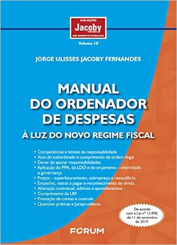 A obra "Manual do ordenador de despesas: À luz do novo regime fiscal" (Editora Fórum - 271p.), escrita por Jorge Ulisses Jacoby Fernandes, faz parte da Coleção Jacoby de Direito Público e aborda diversos aspectos como competências e limites da responsabilidade, atos do subordinado e cumprimento de ordem legal.