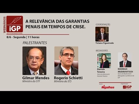 O primeiro encontro terá a presença dos ministros Gilmar Mendes, do STF, e Rogerio Schietti, do STJ, que falarão sobre "A relevância das garantias penais em tempos de crise". O debate será mediado pelos advogados Daniela Teixeira (Advocacia Daniela Teixeira) e Rodrigo Mudrovitsch (Mudrovitsch Advogados). A coordenação fica a cargo do presidente do IGP Ticiano Figueiredo (Figueiredo & Velloso Advogados Associados).