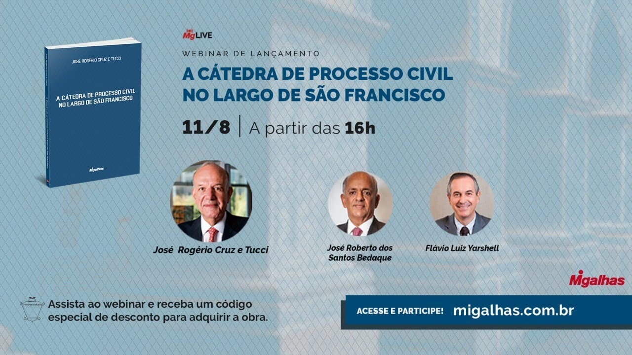 Neste comemorativo dia do advogado, Migalhas tem a honra de realiza o webinar de lançamento do livro "A Cátedra de processo civil no Largo de São Francisco", de José Rogério Cruz e Tucci.