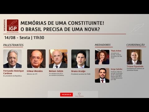 O ex-presidente Fernando Henrique Cardoso, o ministro do STF Gilmar Mendes, o ex-ministro do Supremo e da Defesa Nelson Jobim e o presidente nacional do PSDB Bruno Araújo são os convidados de sexta-feira, 14/8, às 11h30, do webinário do Instituto de Garantias Penais (IGP). O tema da conversa será "Memórias de uma constituinte: o Brasil precisa de uma nova?".