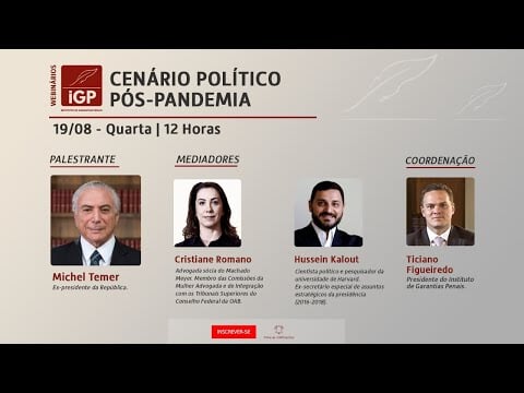 O ex-presidente Michel Temer é o convidado do webinário do Instituto de Garantias Penais (IGP) de hoje, às 12h, para falar sobre o "Cenário político pós-pandemia".