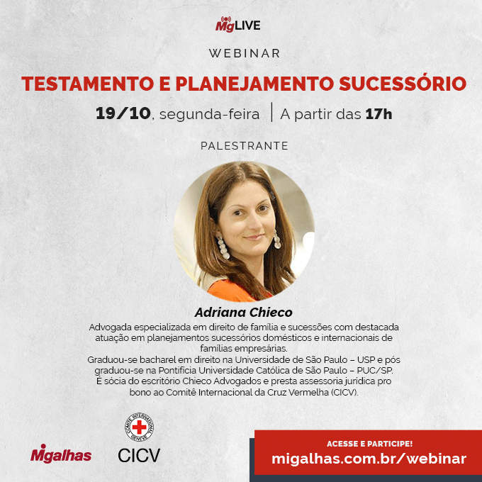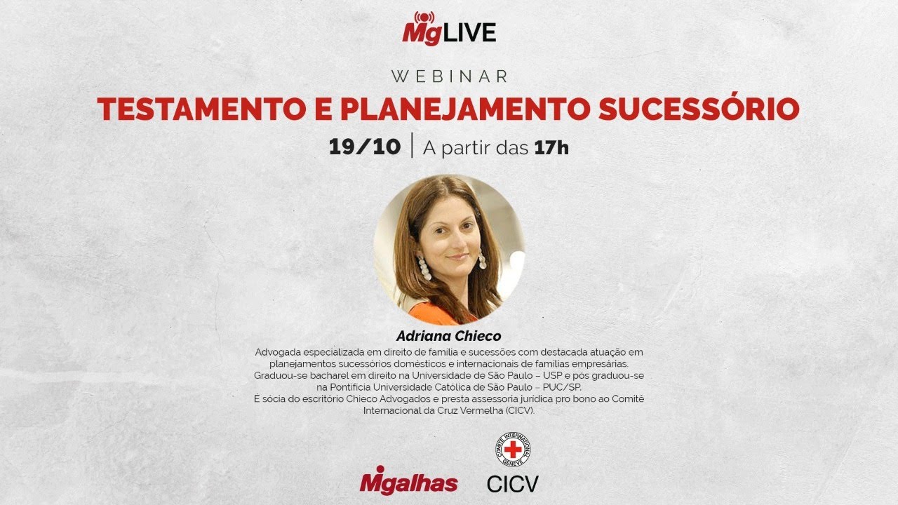 Como o testamento pode ser útil na sucessão, quem pode fazer um testamento e como ele deve ser elaborado são alguns dos temas que serão abordados. O encontro conta com a participação de Adriana Chieco, advogada especializada em direito de família e sucessões.