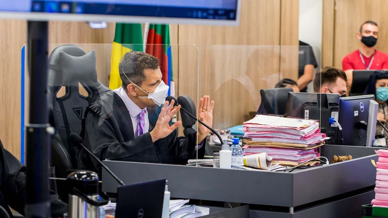 O Tribunal do Júri é formado pelo juiz presidente, Orlando Faccini Neto, e pelo Conselho de Sentença, formado por sete jurados.
