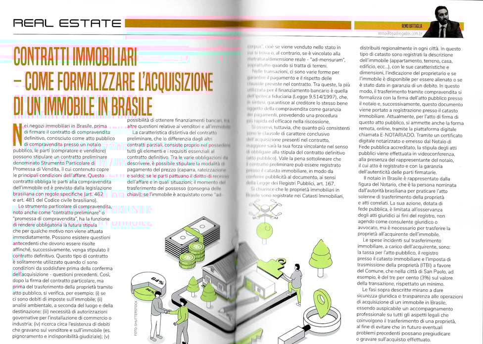 Durante o "Roadshow", será apresentado o guia "Rassegna Giuridica per le Opportunità d'Affari in Brasile", um material com curadoria completa sobre o ambiente de negócios no Brasil. O guia inclui a contribuição de Remo Battaglia, através de um artigo sobre "Contratos Imobiliários - Como formalizar a aquisição de um imóvel no Brasil". O impresso será distribuído aos participantes do evento, servindo como uma importante ferramenta prática e informativa para quem deseja explorar as oportunidades do mercado brasileiro.