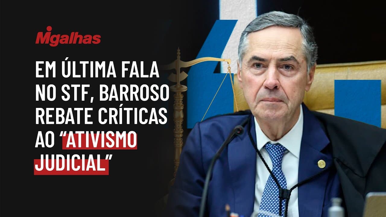 Na sua última manifestação antes de anunciar oficialmente a aposentadoria antecipada, o ministro Luís Roberto Barroso fez reflexão sobre o papel do STF e rejeitou a ideia de que a Corte pratique "ativismo judicial".