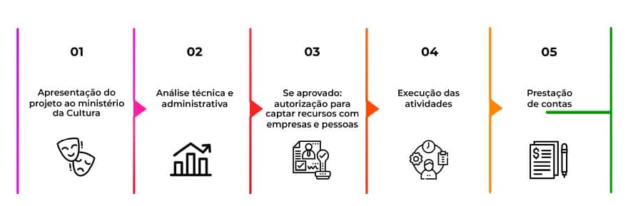 - Um projeto é apresentado ao ministério da Cultura e passa por análise técnica e administrativa.