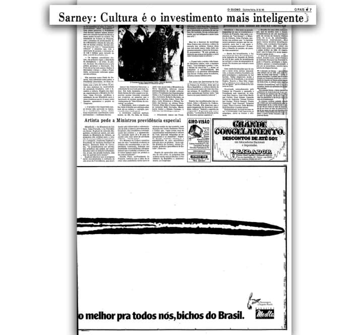 Em reportagem publicada pelo jornal O Globo em junho de 1986 (clique para ampliar), Sarney afirmou que a cultura representava "o investimento mais inteligente" e defendeu que nenhuma nação poderia se afirmar como potência sem consolidar sua base cultural.