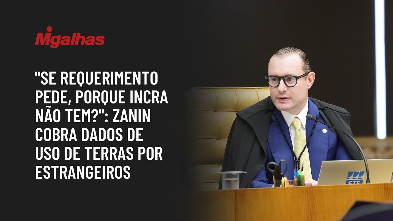 Durante julgamento no STF, nesta quarta-feira, 18, ministro Cristiano Zanin questionou o Incra sobre a aquisição de imóveis rurais por empresas com capital estrangeiro, com foco na efetividade do controle estatal quanto à destinação das terras adquiridas.