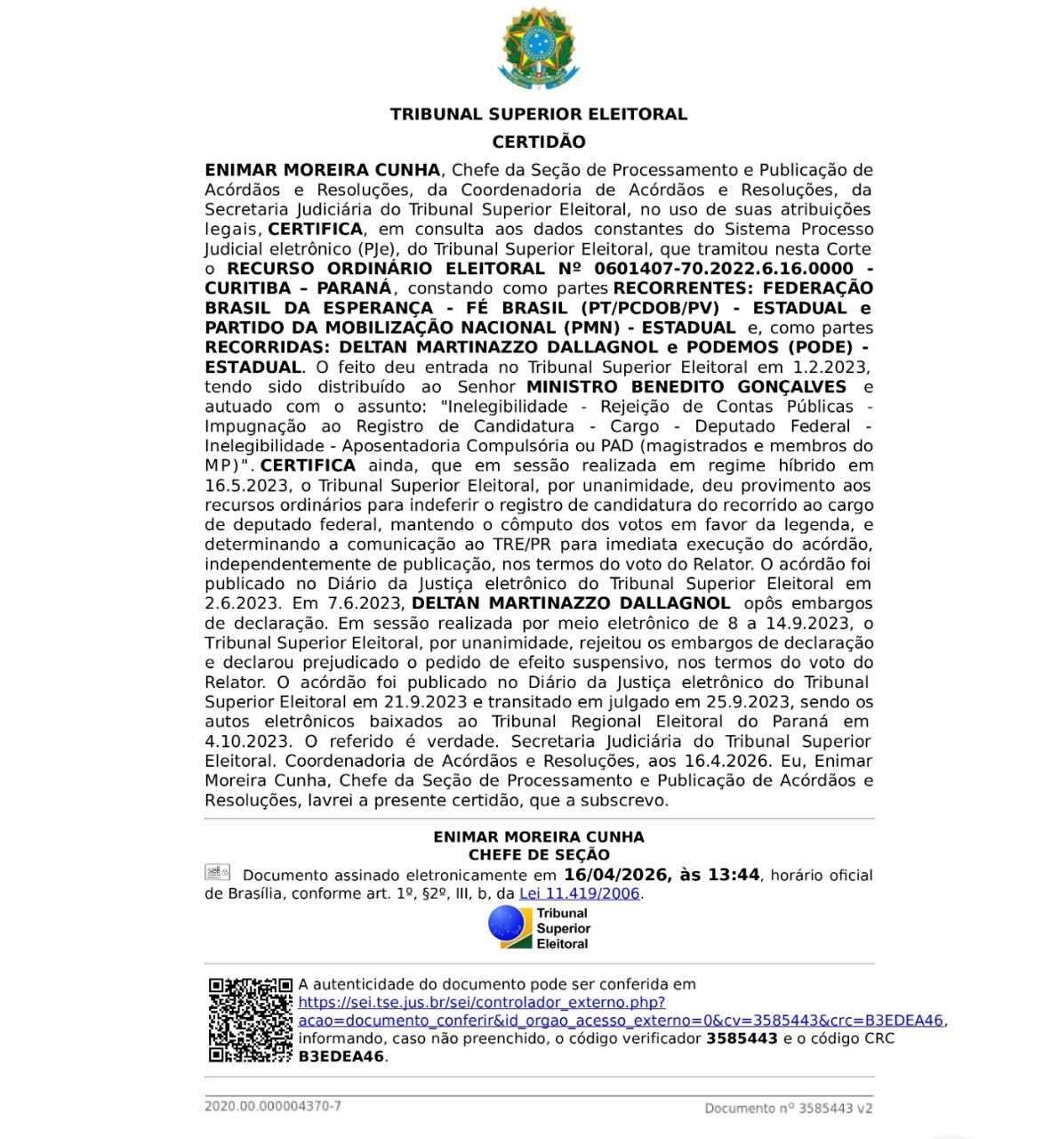 As publicações questionadas, sobretudo dos sites de notícias, tiveram como base uma certidão verdadeira emitida pelo TSE, que resume o andamento de um processo eleitoral relacionado às eleições de 2022 envolvendo Deltan Dallagnol.