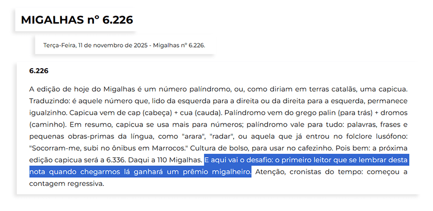 Em novembro de 2025, o informativo Migalhas alcançou a edição 6.226: um palíndromo - ou capicua, para os mais afeitos à tradição ibérica.