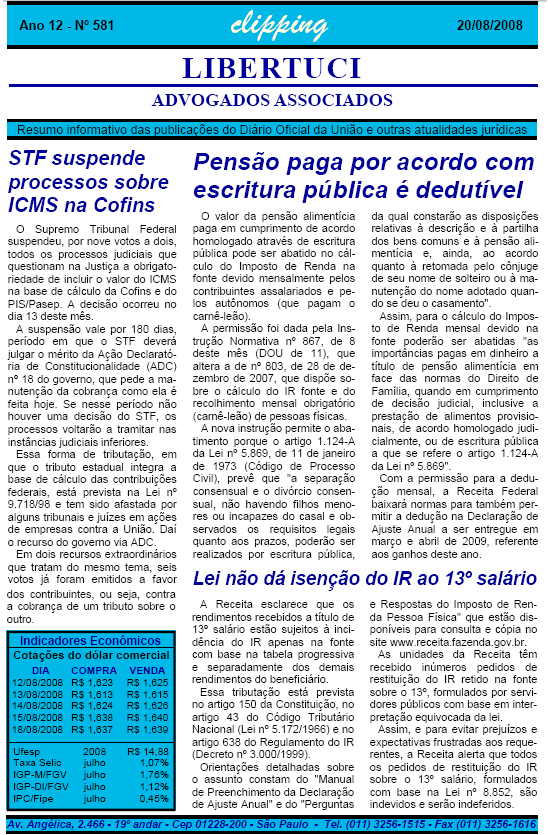 Clipping semanal elaborado pelo escritório Libertuci - Advogados Associados