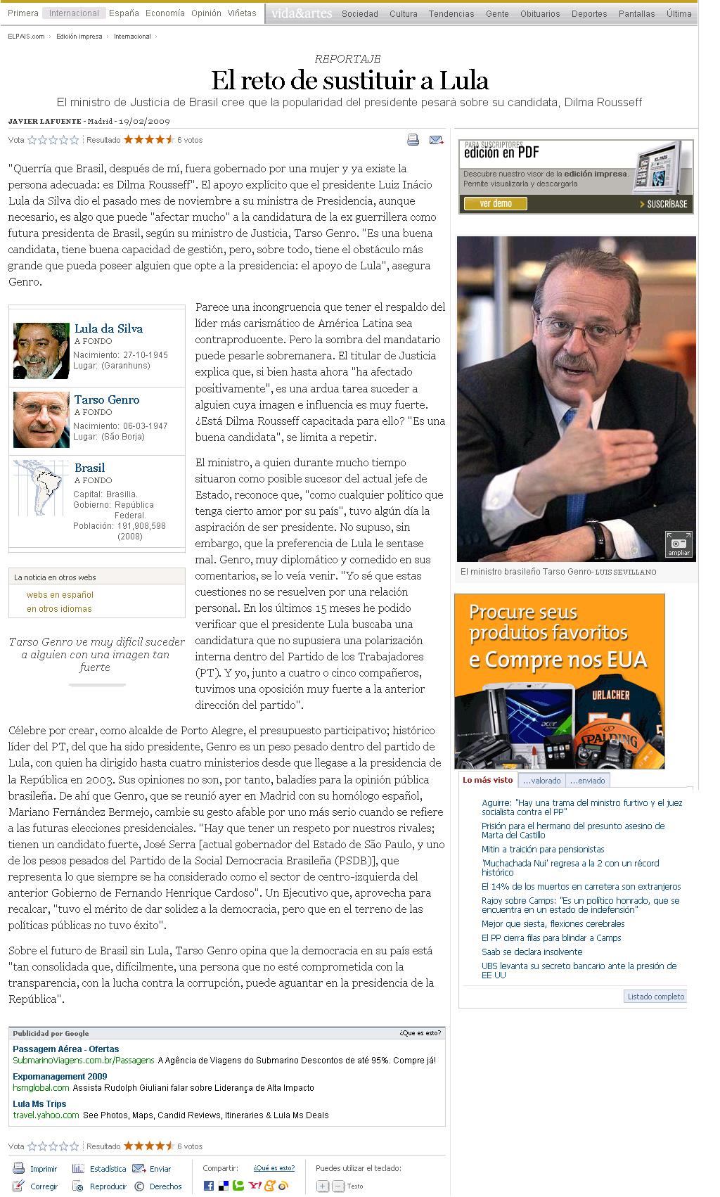 Em entrevista ao jornal espanhol El País no dia 18/2, em Madri, o ministro da Justiça, Tarso Genro, afirmou que o apoio do presidente Luiz Inácio Lula da Silva à ministra Dilma Roussef é a maior vantagem que um candidato à presidência poderia ter.