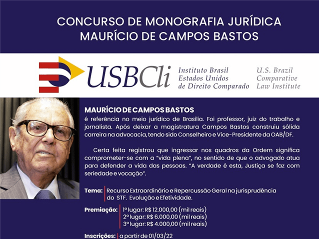 12.abr.2022Abertas as inscrições do "Concurso de Monografia Maurício de Campos Bastos"Os interessados podem se inscrever até 1º de setembro.