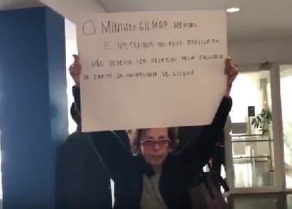 5.abr.2018Brasileira protesta contra Gilmar Mendes durante VI Fórum Jurídico de LisboaCom cartaz chamando o ministro de "traidor do povo brasileiro", mulher falou sobre operação Lava Jato.